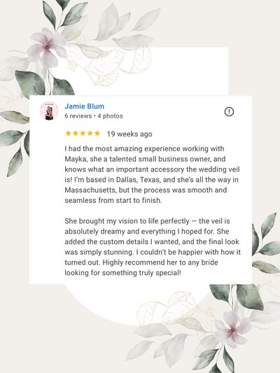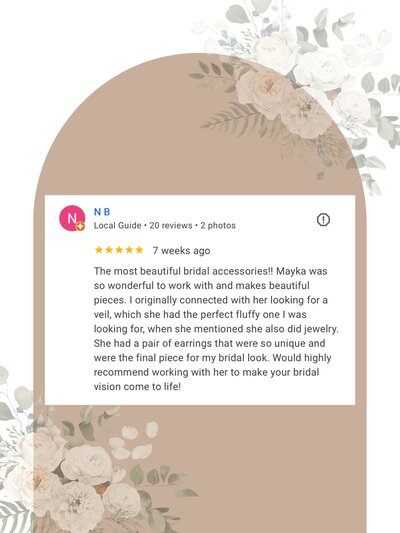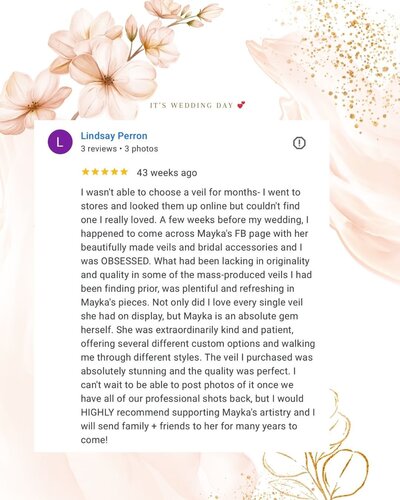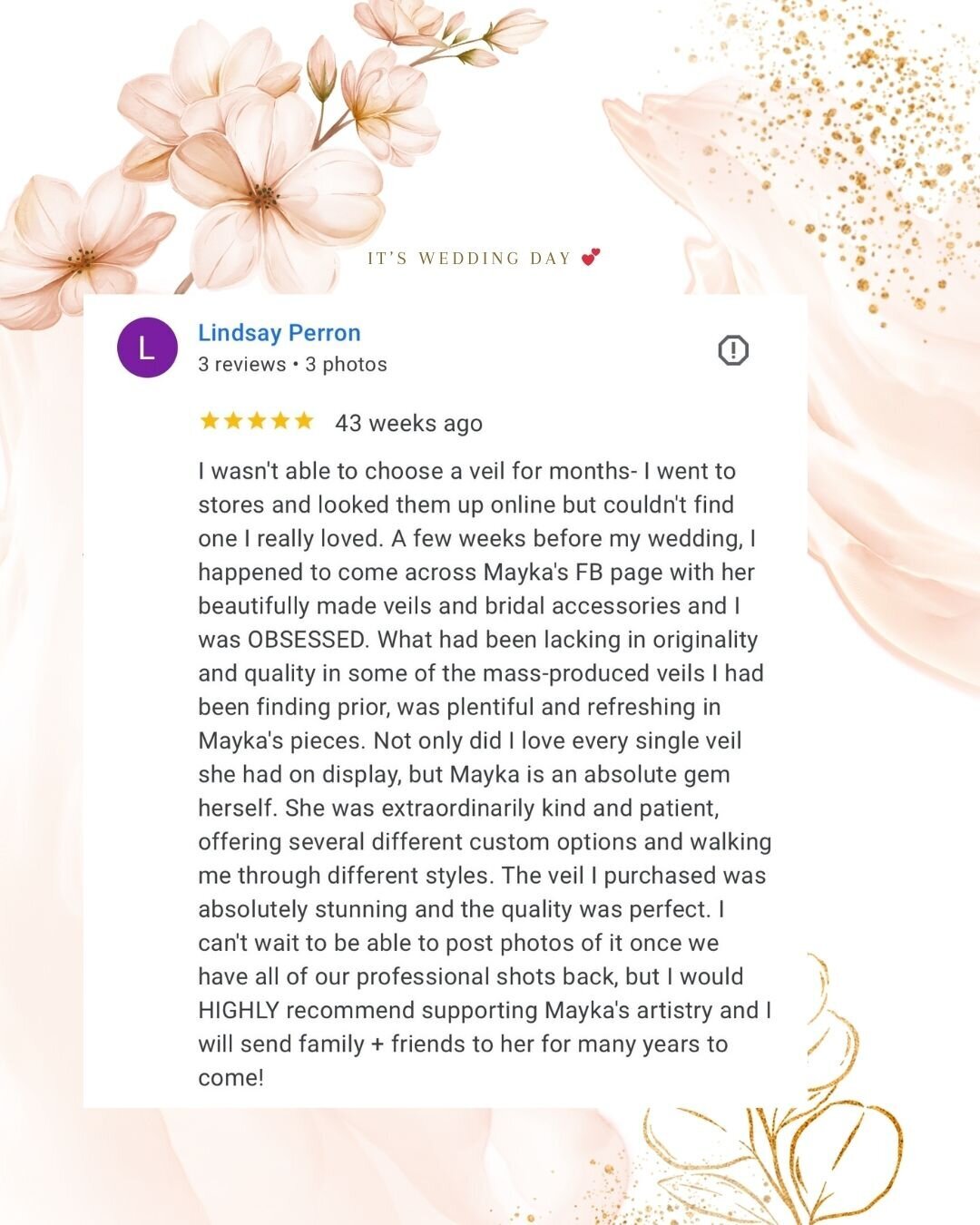 At Mayka Vogue Bridal Accessories, every piece is thoughtfully handcrafted to celebrate the beauty of individuality. From ethereal veils and silky slip dresses to romantic robes, delicate hairpieces, and timeless jewelry, each design is custom made with attention to detail, blending elegance with a touch of modern romance. My goal is to create accessories that feel deeply personal—pieces that not only complete your bridal look, but also become keepsakes of your most unforgettable day.